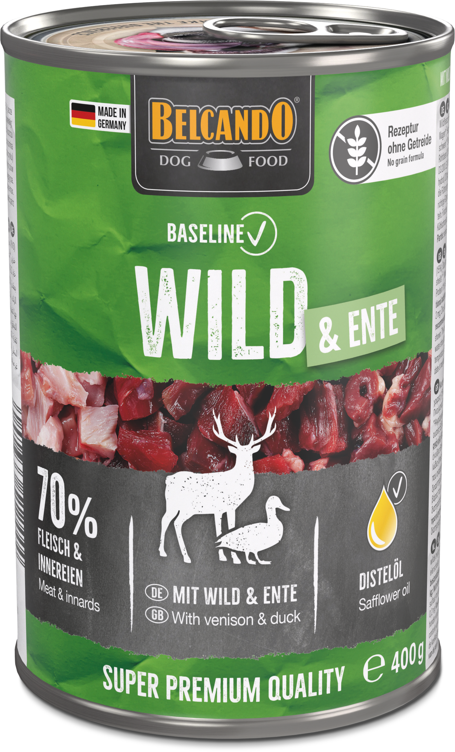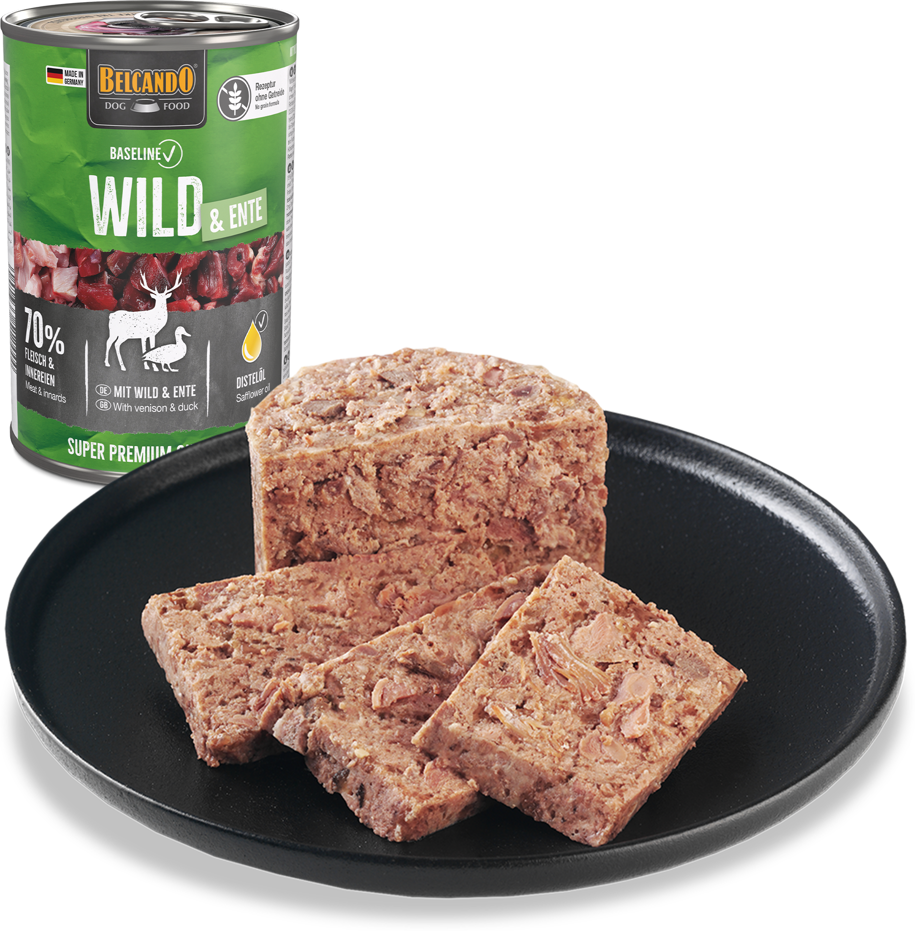 Zusammensetzung: Wildfleisch (Hirsch, Wildschwein) (15 %); Entenfleisch (13 %); Fleischbrühe*¹*²*³*⁴ (26,8 %); Leber*¹; Magen*¹; Herz*¹; Niere*¹; Lunge*¹; Eierschalen*⁵; Mineralstoffe; Distelöl (0,2 %) *¹Schwein *²Hirsch *³Wildschwein *⁴Ente *⁵getrocknetAnalytische Bestandteile: Protein 11 %; Fettgehalt 5,5 %; Rohasche 2,2 %; Rohfaser 0,3 %; Feuchtigkeit 79 %Ernährungsphysiologische Zusatzstoffe: Vitamin D3 200 I.E.; Vitamin E 50 mg; Mangan (als Mangan(II)-sulfat, Monohydrat) 2 mg; Zink (als Zinksulfat, Monohydrat) 20 mg; Jod (als Kalziumjodat, wasserfrei) 0,2 mg