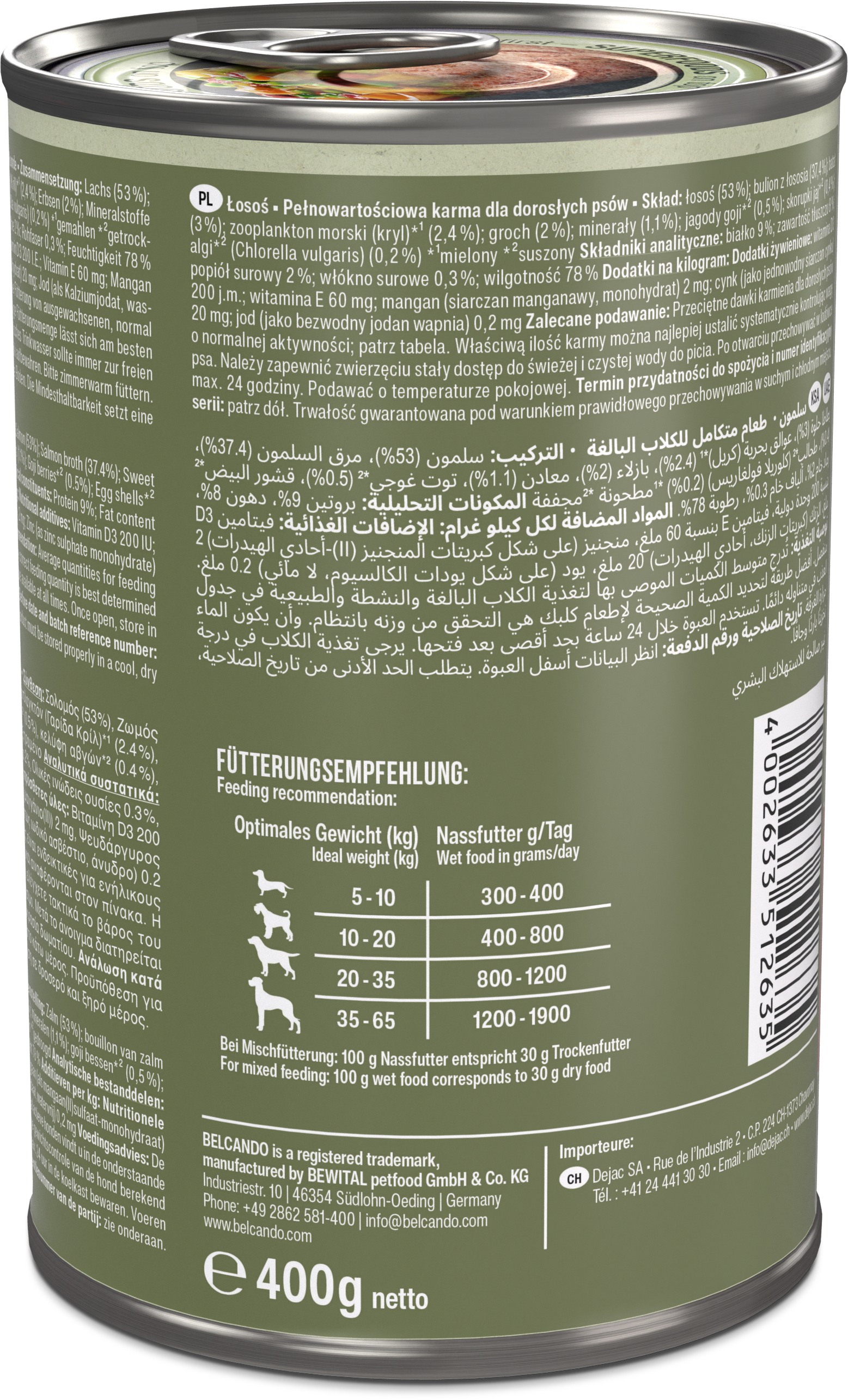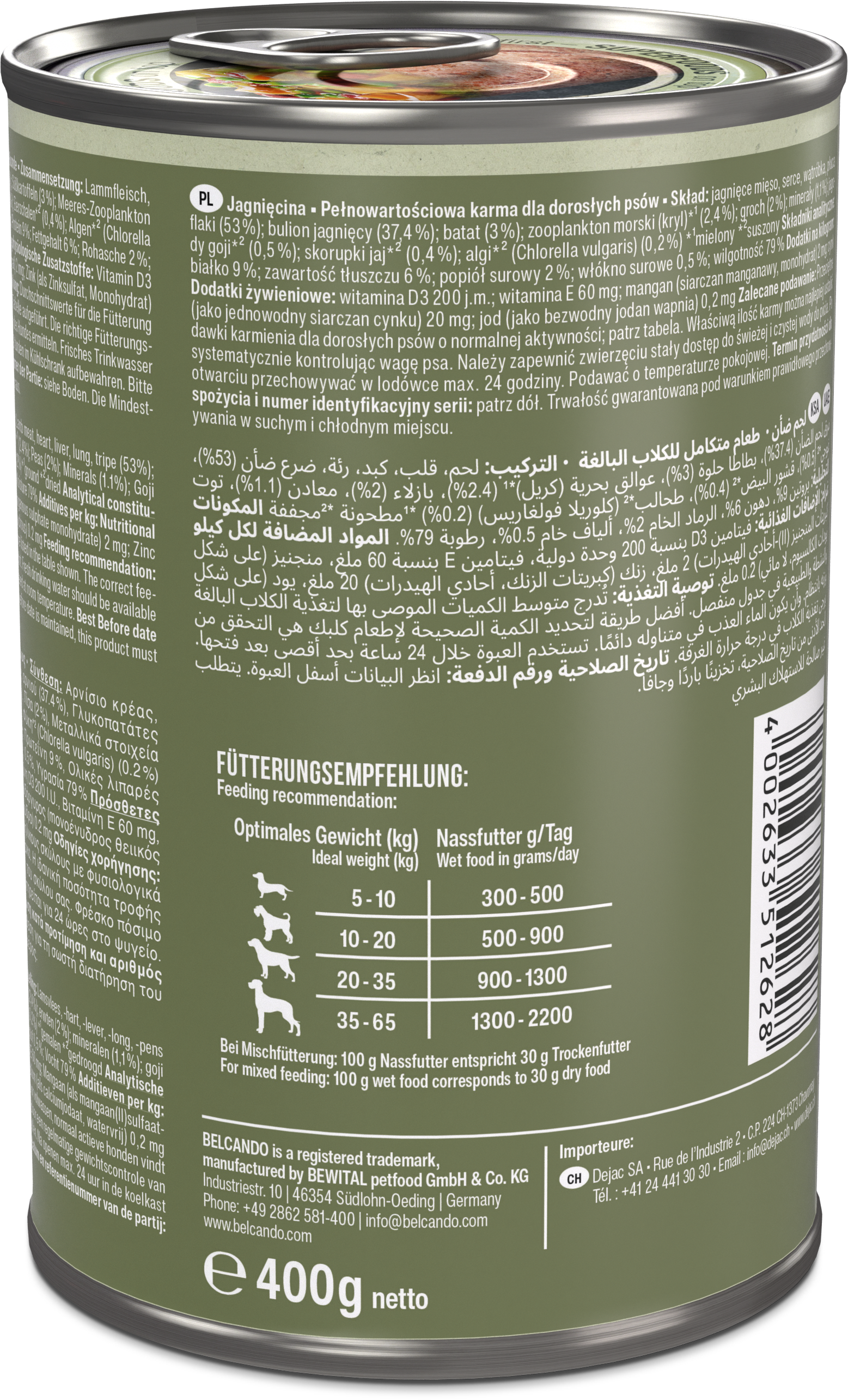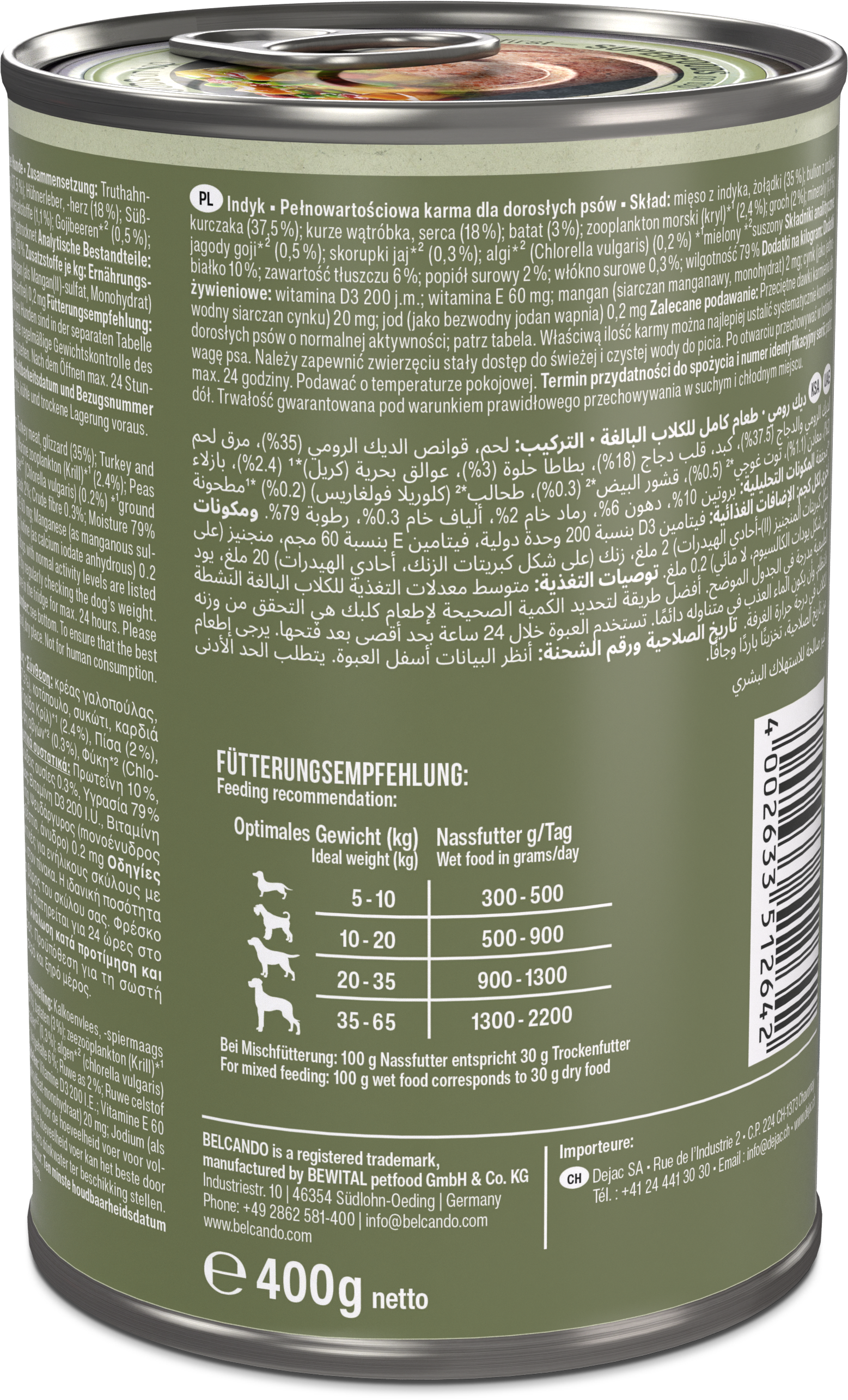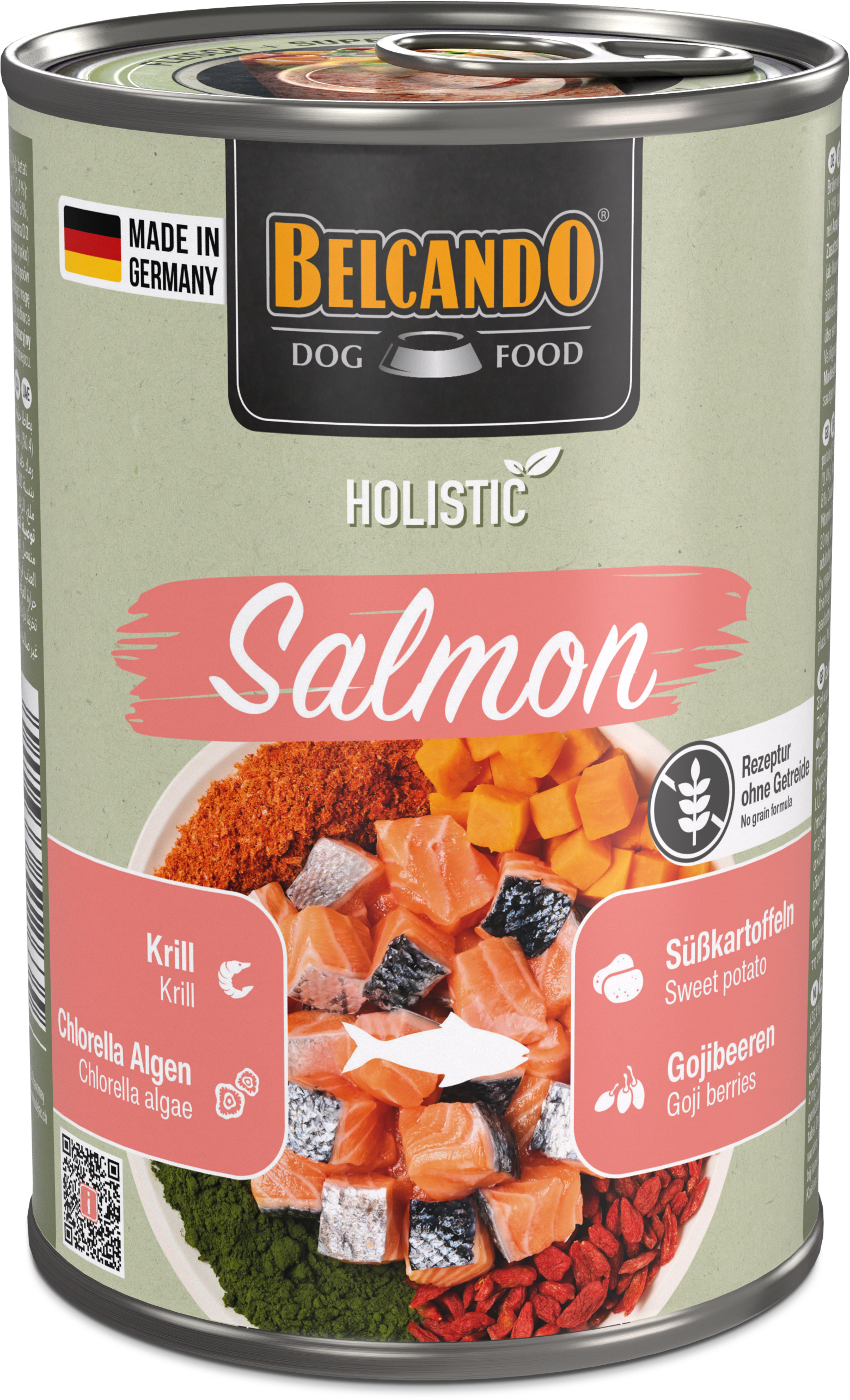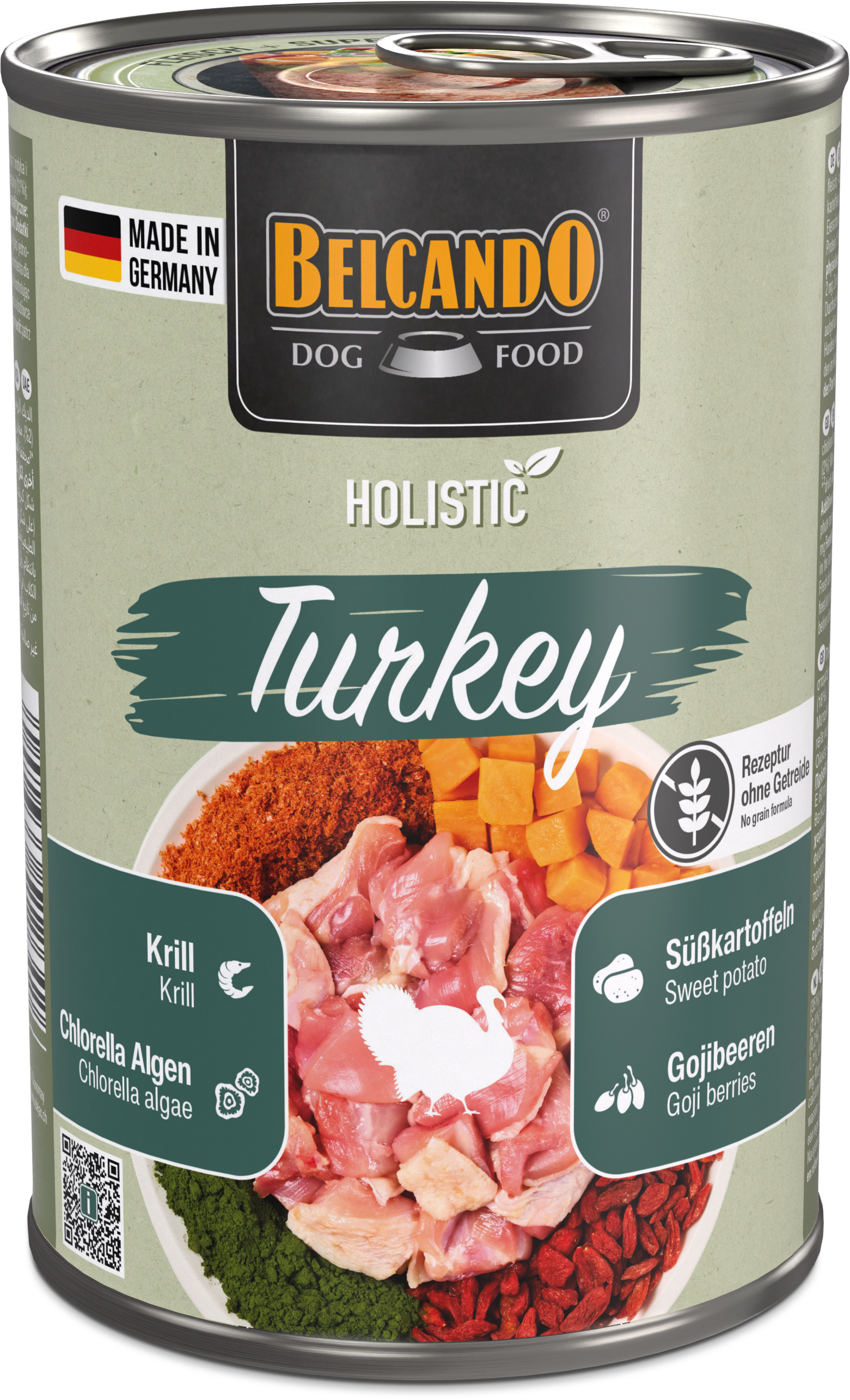 Wir setzen bewusst auf natürliche, sorgfältig aufeinander abgestimmte Zutaten und verzichten auf Getreide sowie künstliche Farb-, Geschmacks- und Konservierungsstoffe. Denn für uns bedeutet eine ganzheitliche, „holistische“ Ernährung nicht nur, den Organismus Deines Hundes optimal zu versorgen, sondern auch sein Wohlbefinden und seine Vitalität zu fördern.Truthahn:Zusammensetzung: Truthahnfleisch, -muskelmagen (35 %); Fleischbrühe von Truthahn und Huhn (37,5 %); Hühnerleber, -herz (18 %); Süßkartoffeln (3 %); Meeres-Zooplankton (Krill)*¹ (2,4 %); Erbsen (2 %); Mineralstoffe (1,1 %); Gojibeeren*² (0,5 %); Eierschalen*² (0,3 %); Algen*² (Chlorella vulgaris) (0,2 %) *¹gemahlen *²getrocknetAnalytische Bestandteile: Protein 10 %; Fettgehalt 6 %; Rohasche 2 %; Rohfaser 0,3 %; Feuchtigkeit 79 %Ernährungsphysiologische Zusatzstoffe: Vitamin D3 200 I.E.; Vitamin E 60 mg; Mangan (als Mangan(II)-sulfat, Monohydrat) 2 mg; Zink (als Zinksulfat, Monohydrat) 20 mg; Jod (als Kalziumjodat, wasserfrei) 0,2 mgLamm:Zusammensetzung: Lammfleisch, -herz, -leber, -lunge, -pansen (53 %); Fleischbrühe vom Lamm (37,4 %); Süßkartoffeln (3 %); Meeres-Zooplankton (Krill)*¹ (2,4 %); Erbsen (2 %); Mineralstoffe (1,1 %); Gojibeeren*² (0,5 %); Eierschalen*² (0,4 %); Algen*² (Chlorella vulgaris) (0,2 %) *¹gemahlen *²getrocknetAnalytische Bestandteile: Protein 9 %; Fettgehalt 6 %; Rohasche 2 %; Rohfaser 0,5 %; Feuchtigkeit 79 %Ernährungsphysiologische Zusatzstoffe: Vitamin D3 200 I.E.; Vitamin E 60 mg; Mangan (als Mangan(II)-sulfat, Monohydrat) 2 mg; Zink (als Zinksulfat, Monohydrat) 20 mg; Jod (als Kalziumjodat, wasserfrei) 0,2 mgLachs:Zusammensetzung: Lachs (53 %); Brühe vom Lachs (37,4 %); Süßkartoffeln (3 %); Meeres-Zooplankton (Krill)*¹ (2,4 %); Erbsen (2 %); Mineralstoffe (1,1 %); Gojibeeren*² (0,5 %); Eierschalen*² (0,4 %); Algen*² (Chlorella vulgaris) (0,2 %) *¹gemahlen *²getrocknetAnalytische Bestandteile: Protein 9 %; Fettgehalt 8 %; Rohasche 2 %; Rohfaser 0,3 %; Feuchtigkeit 78 %Ernährungsphysiologische Zusatzstoffe: Vitamin D3 200 I.E.; Vitamin E 60 mg; Mangan (als Mangan(II)-sulfat, Monohydrat) 2 mg; Zink (als Zinksulfat, Monohydrat) 20 mg; Jod (als Kalziumjodat, wasserfrei) 0,2 mg