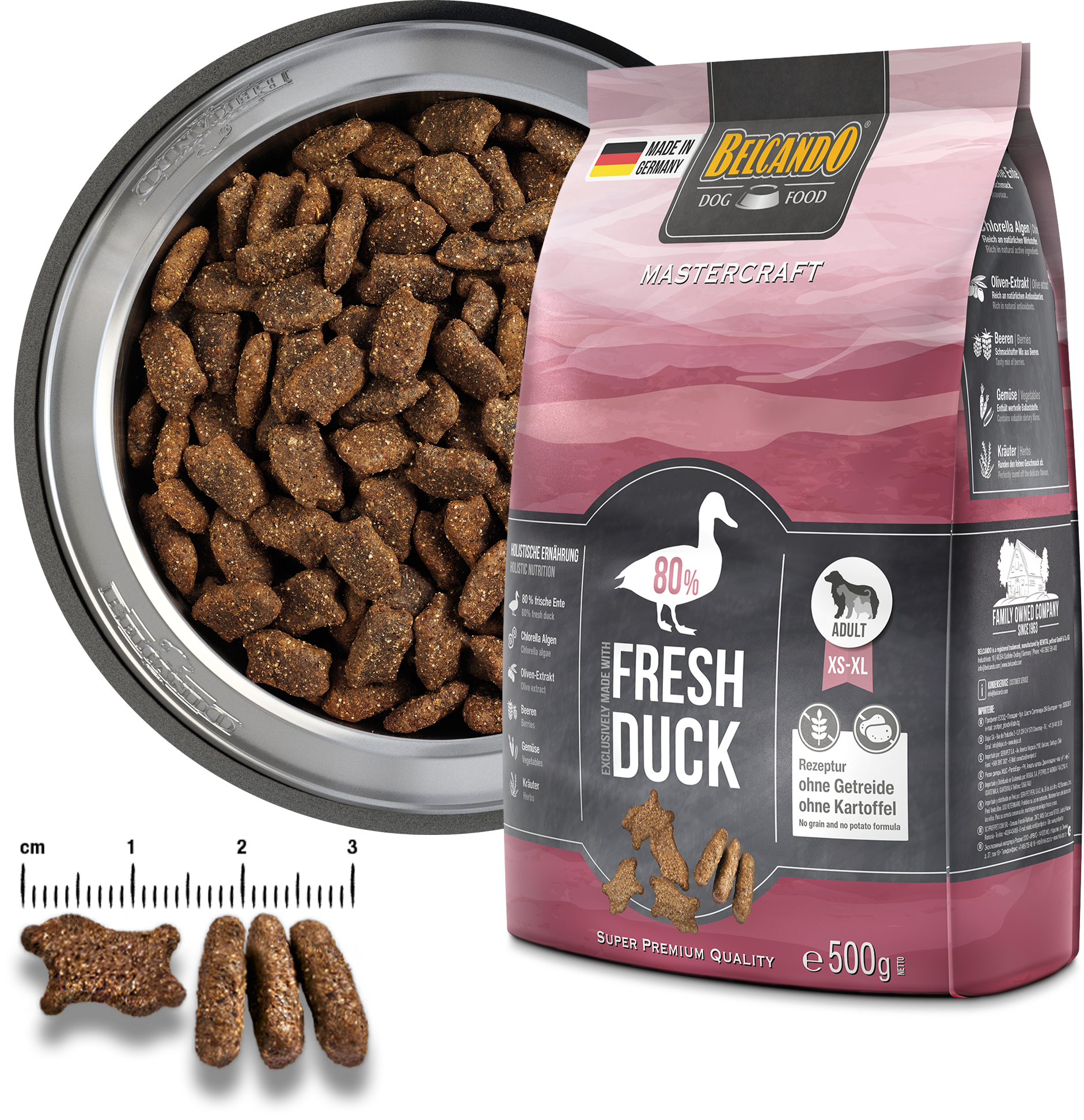 Fleisch ist ein kostbares Gut – daher entspricht es unserer Überzeugung, es nur auf die bestmögliche Art zuzubereiten. Für BELCANDO® MASTERCRAFT verarbeiten wir ausschließlich frisches Fleisch und verzichten auf vorgetrocknetes Fleischmehl, welches selbst bei hochwertigeren Trockennahrungen eingesetzt wird. Damit haben wir eine Zubereitung erreicht, die bisher als unmöglich galt. Mit unserer besonders schonenden Fresh Meat Technologie wird das frische Fleisch direkt zu einer Krokette verarbeitet. So können wir Vortrocknungsstufen einsparen und die verwendeten Zutaten bleiben bis kurz vor der Verarbeitung frisch. Nur dadurch entfaltet sich später der volle Geschmack des Fleisches in der Krokette.
