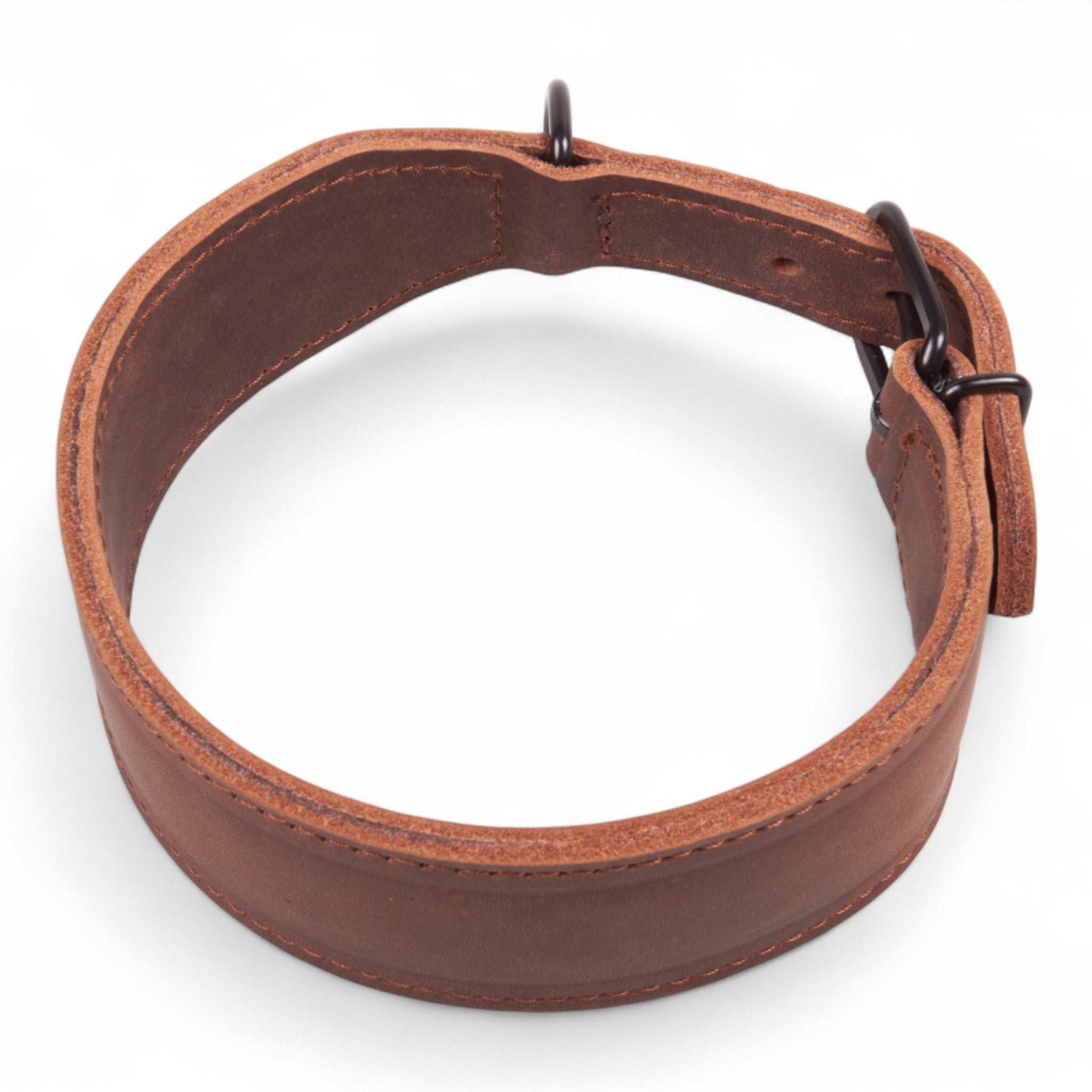 Ein extrabreites Fettlederhalsband mit schwarzen Metallbeschlägen ist ein robustes und stilvolles Accessoire für Hunde, das Komfort und Langlebigkeit bietet. Das breite Lederband sorgt für eine gleichmäßige Verteilung des Drucks auf den Hals des Hundes und bietet dadurch zusätzlichen Schutz.
