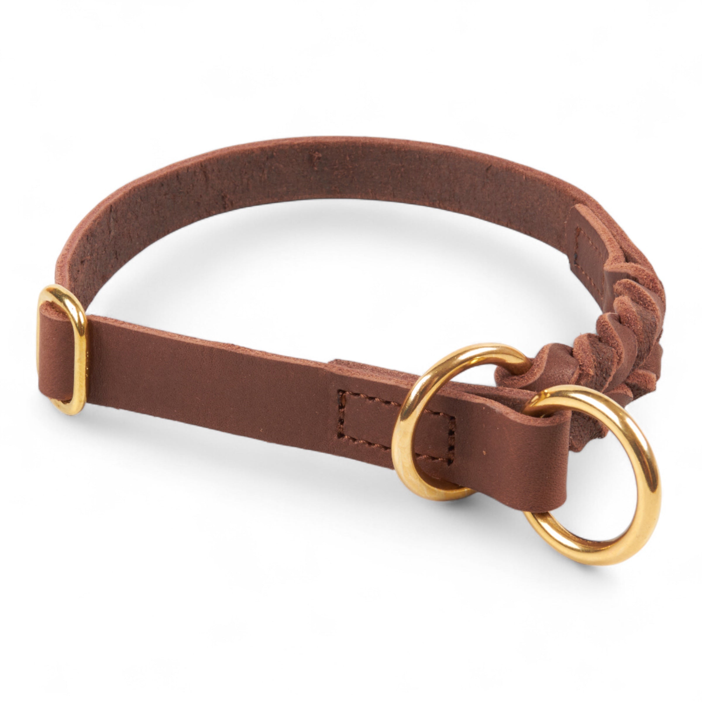 Diese Variante des Zugstopp-Halsbands verbindet elegante Messingbeschläge mit einem sorgfältig teilgeflochtenen Stück und bietet dadurch eine stilvolle wie funktionale Alternative. Dank der leichten, schlanken Bauweise eignet sich das Halsband besonders für Hunde mit zierlicher Statur oder für den täglichen Gebrauch, bei dem angenehmes Tragen und geringes Gewicht im Vordergrund stehen.