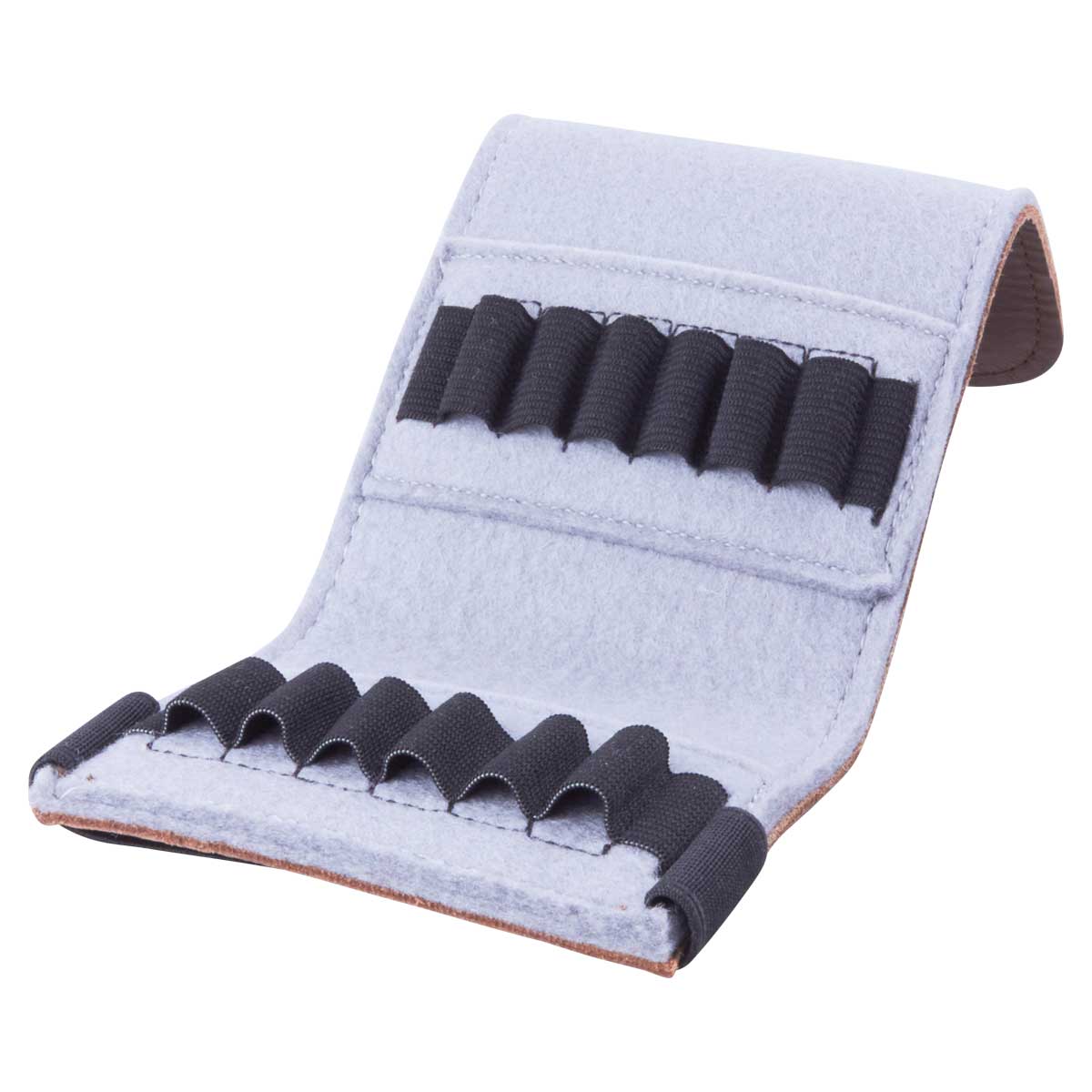 Unser exklusives Patronenetui aus geschmeidigem Fettleder mit hochwertiger Wollfilzeinlage wird komplett miteinander vernäht, um die Patronen optimal vor Anlaufen (Oxidation) zu schützen. Das Etui ist komplett aufklappbar und über eine Gummilasche schnell und einfach zu schließen.