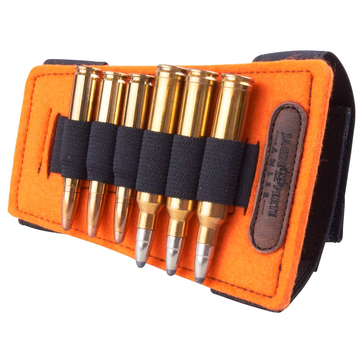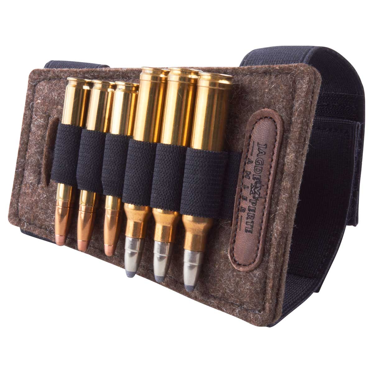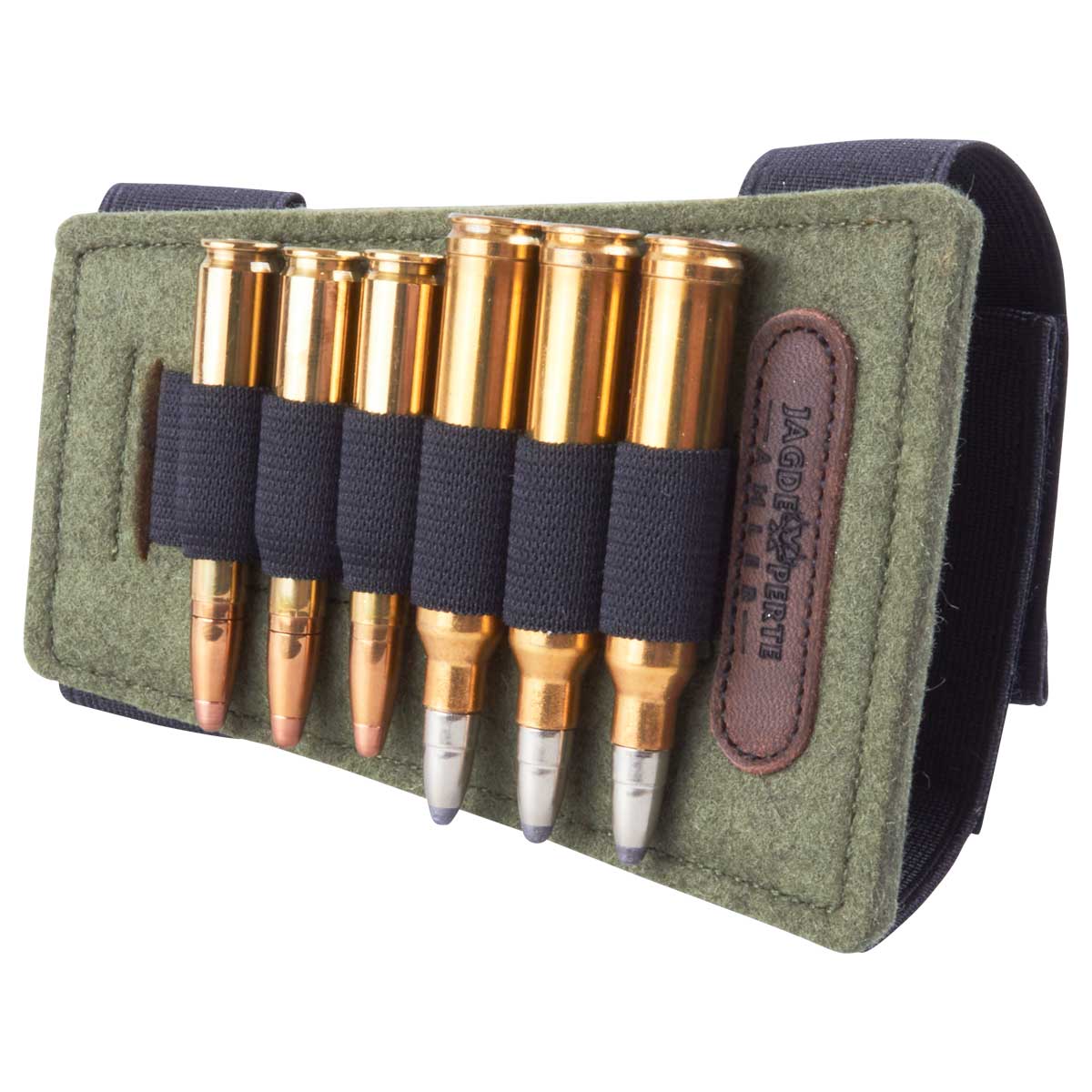 Das Schaft-Patronenetui aus hochwertigem Wollfilz, bietet Platz für bis zu 6 gängige Kugelpatronen (egal ob z.B. 5,6x50R, .30-06, .308 WIN, 6,5x65R, 7x57, .300 WIN MAG, usw.). Das Etui hat an der Rückseite 2 Gummilaschen, welche praktisch über einen Klettverschluss angelegt werden können, somit passt das Etui problemlos an allen Schäften.